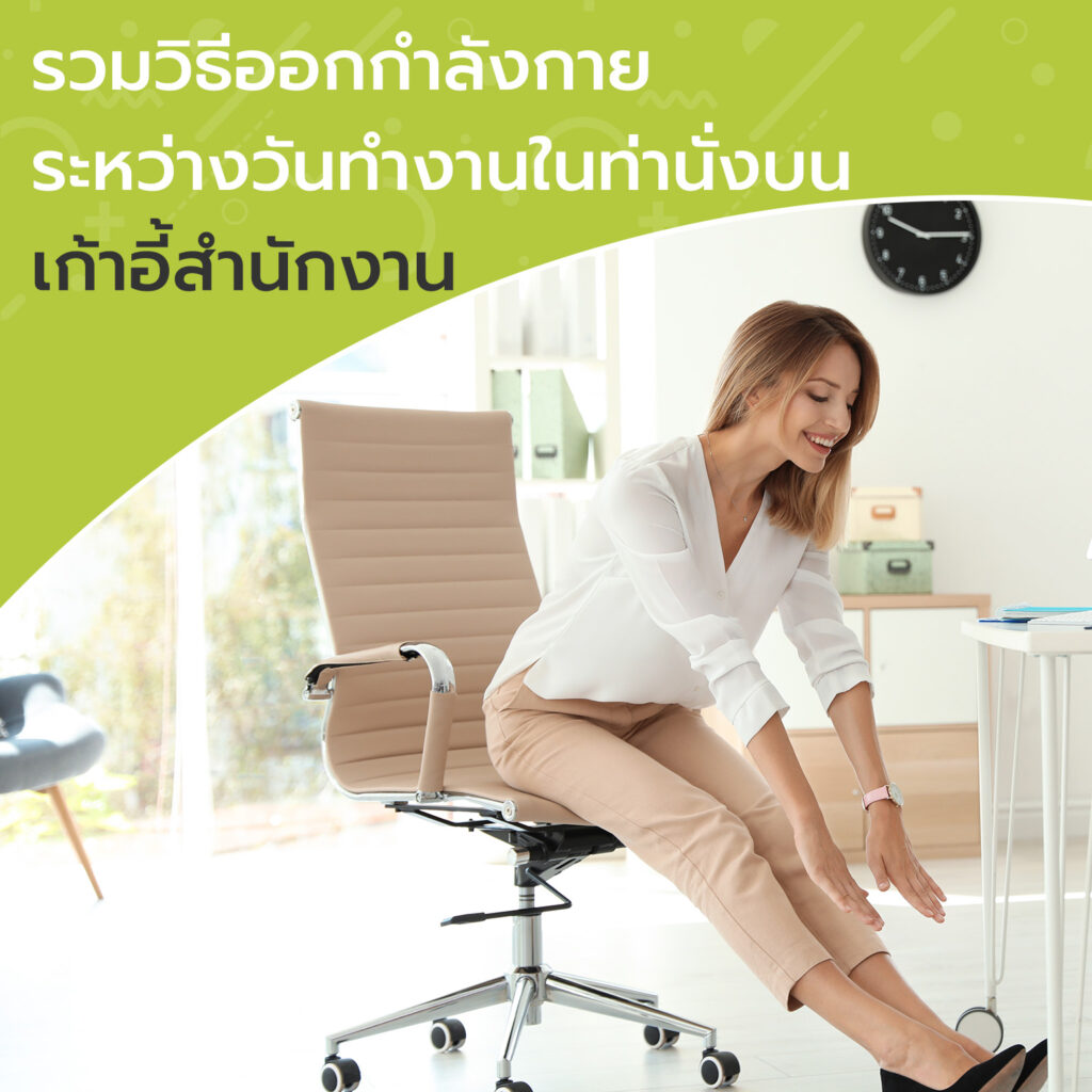 สุขภาพที่ดีเป็นสิ่งที่ทุกคนปรารถนา แต่ด้วยวิถีการดำเนินชีวิตที่เปลี่ยนไป โดยเฉพาะด้านการทำงาน ทั้งการที่จะต้องทำงานแข่งกับเวลา รวมถึงการเกิดวิกฤตการณ์โรคระบาดที่ผ่านมาจนทำให้หลาย ๆ คนต้องเปลี่ยนวิถีการทำงานอยู่กับบ้าน ก็เป็นตัวแปรสำคัญที่ทำให้การใช้ชีวิตแบบ Work-Life Balance เพื่อชีวิตสมดุลกลายเป็นเรื่องยากมากขึ้น และอีกหนึ่งปัญหาที่มาพร้อมกับการทำงานอยู่กับที่นาน ๆ ซึ่งหลายท่านกำลังเผชิญนั่นก็คือ อาการปวดหลัง ปวดเมื่อยต้นคอ บ่า ไหล่ ที่นำไปสู่ออฟฟิศซินโดรม ที่ยกขบวนทีมเวิร์กความปวดเมื่อยทั้งคอ บ่า ไหล่ และหลังส่วนบนมาโดยพร้อมเพรียงกันโดยสาเหตุหลักของออฟฟิศซินโดรมนั้น มาจากการนั่งเก้าอี้สำนักงานที่ไม่เหมาะสมกับสรีระ ทำให้นั่งผิดท่า และอุปกรณ์มีความแข็งเกินไป ทำให้นั่งไม่สบาย ซึ่งหนึ่งในวิธีการแก้ปัญหาและบรรเทาอาการออฟฟิศซินโดรม ก็เริ่มได้จากการเลือกใช้เก้าอี้สำนักงานที่รองรับกับสรีระพร้อมปรับท่านั่งให้ถูกต้องได้นั่นเองแต่ถึงแม้ว่าคุณจะใช้เก้าอี้สำนักงาน ที่เป็นเก้าอี้สุขภาพที่ช่วยให้การนั่งทำงานได้สบายขึ้นแล้วก็ตาม ก็ไม่ควรพลาดที่จะยืดเส้นยืดสายระหว่างการทำงานบ้าง เพื่อให้ร่างกายและสมองได้พักสักเล็กน้อย เตรียมพร้อมลุยงานต่อได้ตลอดทั้งวัน ซึ่งมีวิธีออกกำลังกายง่าย ๆ ในระหว่างวันทำงาน โดยใช้บริเวณแค่โต๊ะทำงาน และใช้อุปกรณ์แค่เก้าอี้ทำงานของคุณเท่านั้น