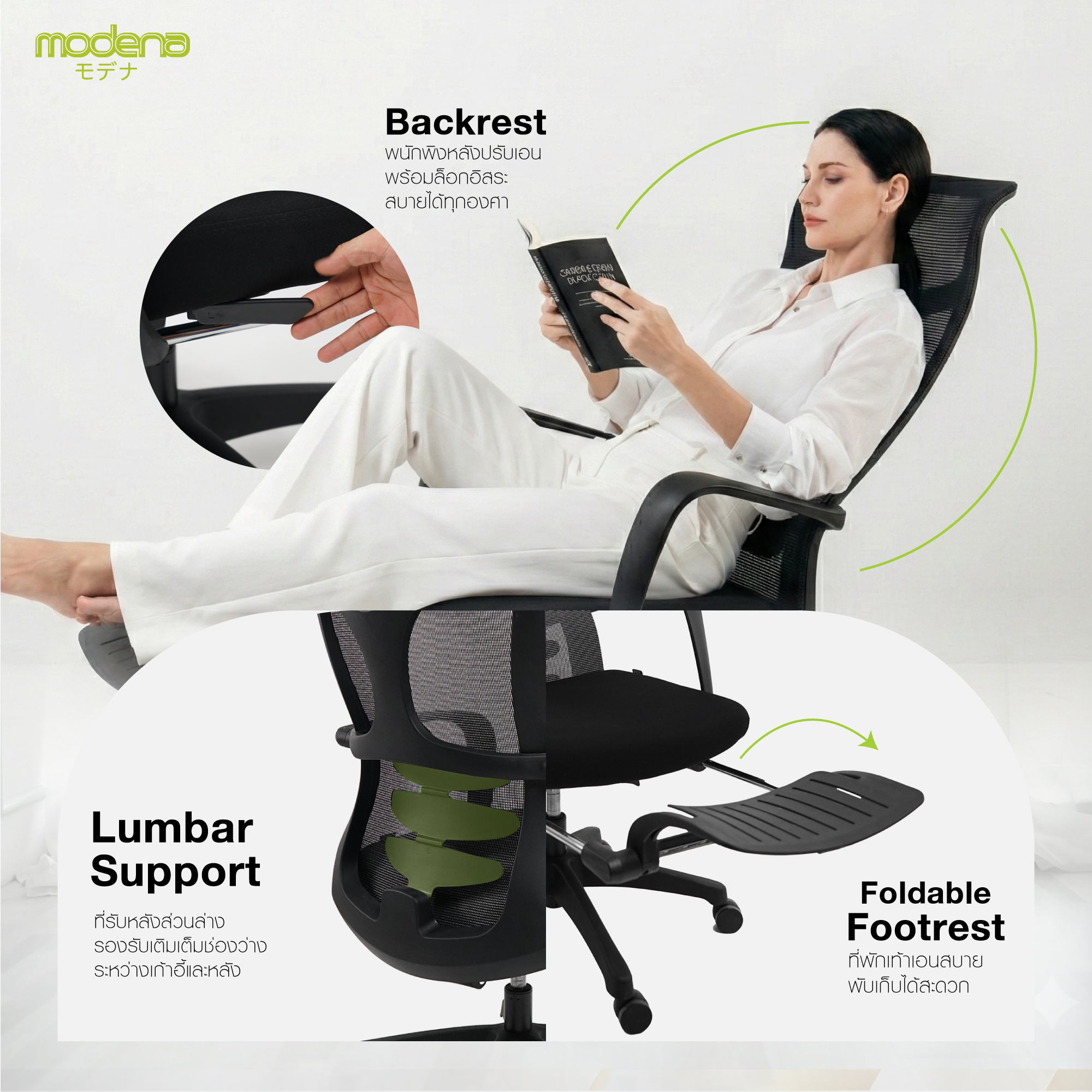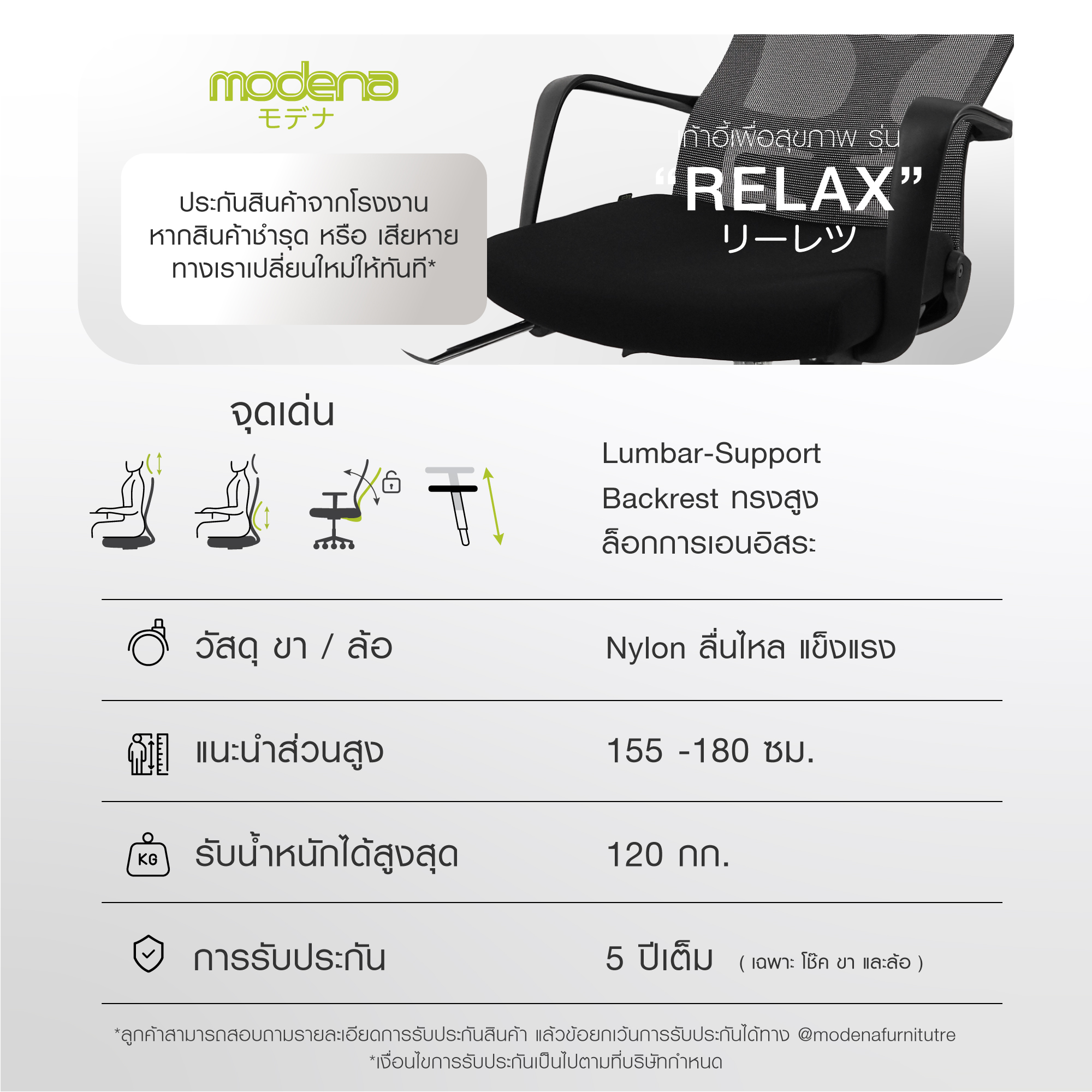 ตอบโจทย์ทุกความสบายของคุณ ด้วยเก้าอี้เพื่อสุขภาพ รุ่น CINDY RELAX จากแบรนด์ MODENA ด้วย Lumbar Support เพื่อเพิ่มการรองรับหลังช่วงล่างได้อย่างดี สามารถปรับระดับให้เข้ากับสรีระผู้นั่งได้ พนักพิงผลิตจากผ้าตาข่ายที่ไม่ทำให้อับชื้น มีความยืดหยุ่นสูง จึงสามารถรองรับการเคลื่อนไหวได้ดี นั่งสบายด้วยเบาะนั่งที่นุ่มเด้งบุด้วยฟองน้ำอย่างดี หุ้มด้วยผ้าตาข่ายที่ระบายอากาศได้ดี ทั้งนี้เก้าอี้ถูกออกแบบมาเพื่อรองรับสรีระของผู้นั่ง จึงสามารถปรับเอนพนักพิง และความสูงของเก้าอี้ เพื่อให้คุณได้นั่งทำงานหรือพักผ่อนอย่างสะดวกสบาย ผ่อนคลายจากความเมื่อยล้า