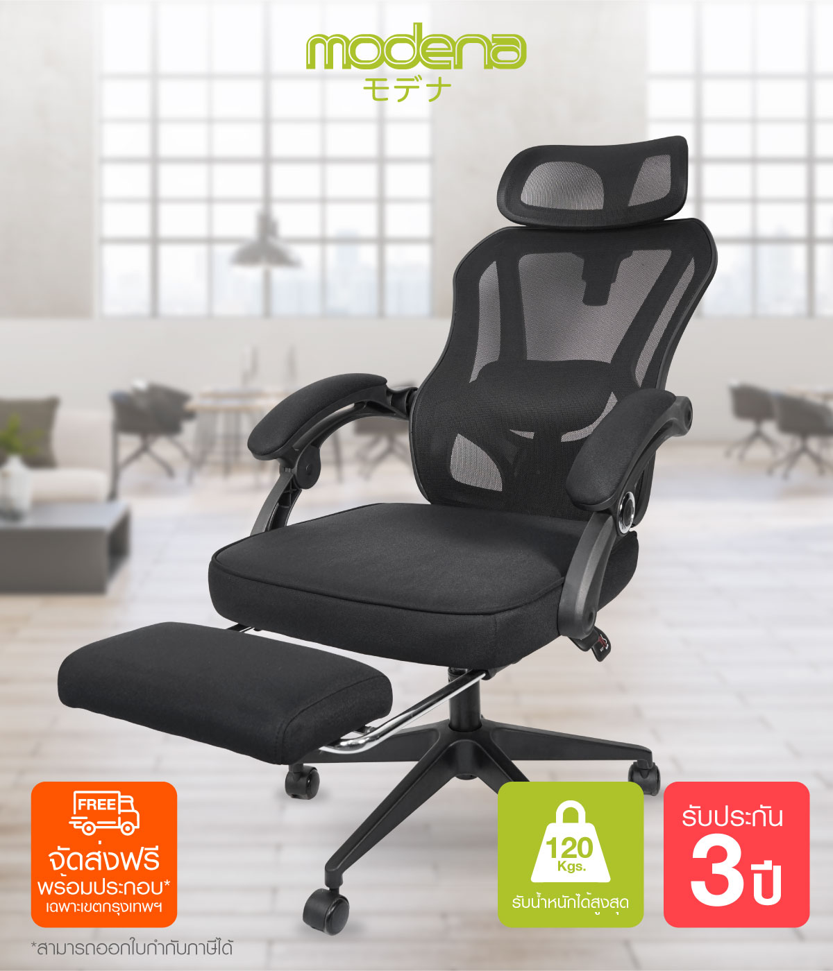 • ปรับเอนและล็อกได้ พร้อม ที่พักขา เพิ่มความสบายช่วงพัก
